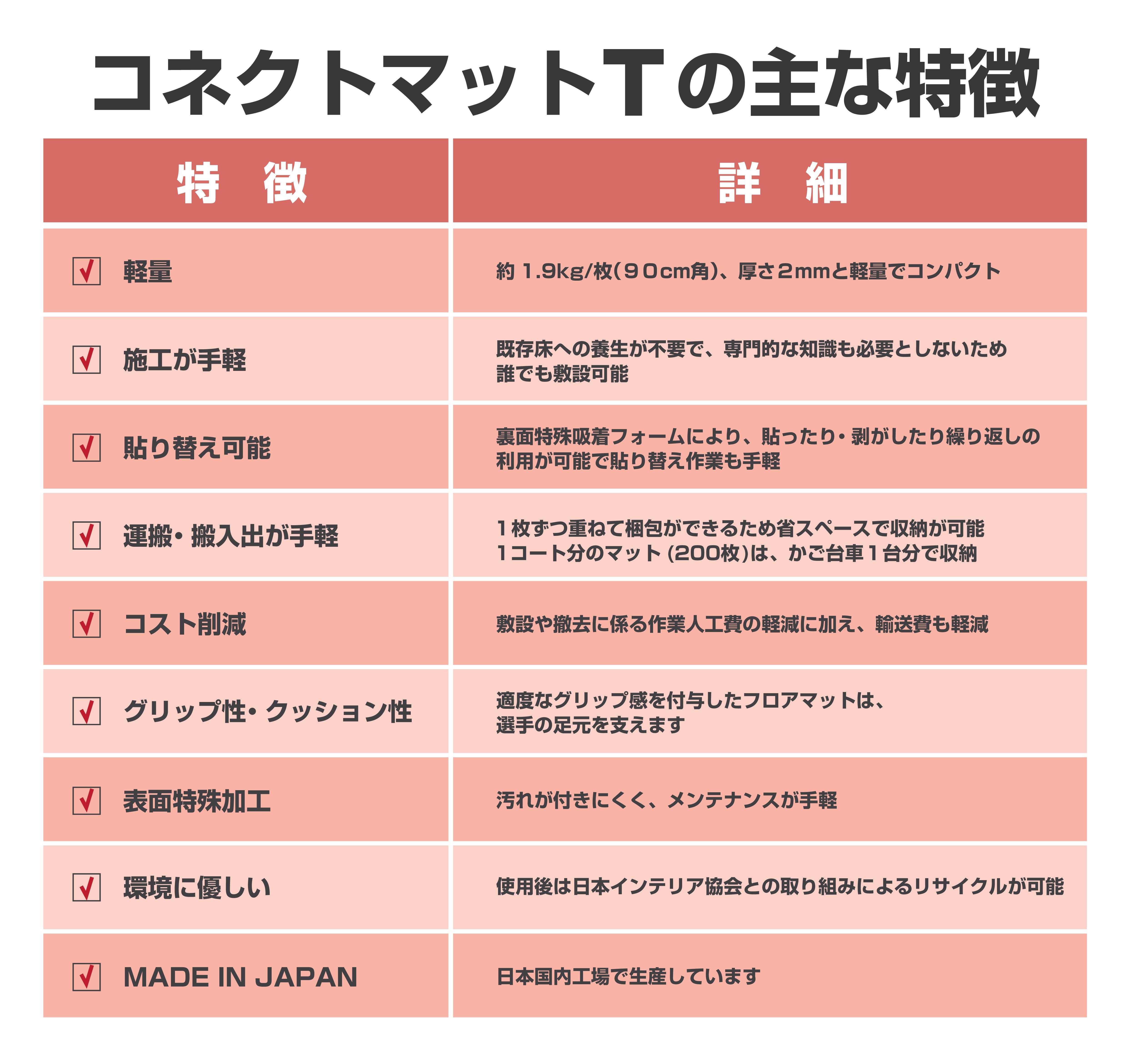 コネクトマットTは、卓球リーグT.LEAGUEの公式フロアマットとして採用されており、国際卓球連盟の認証取得も予定している製品です。