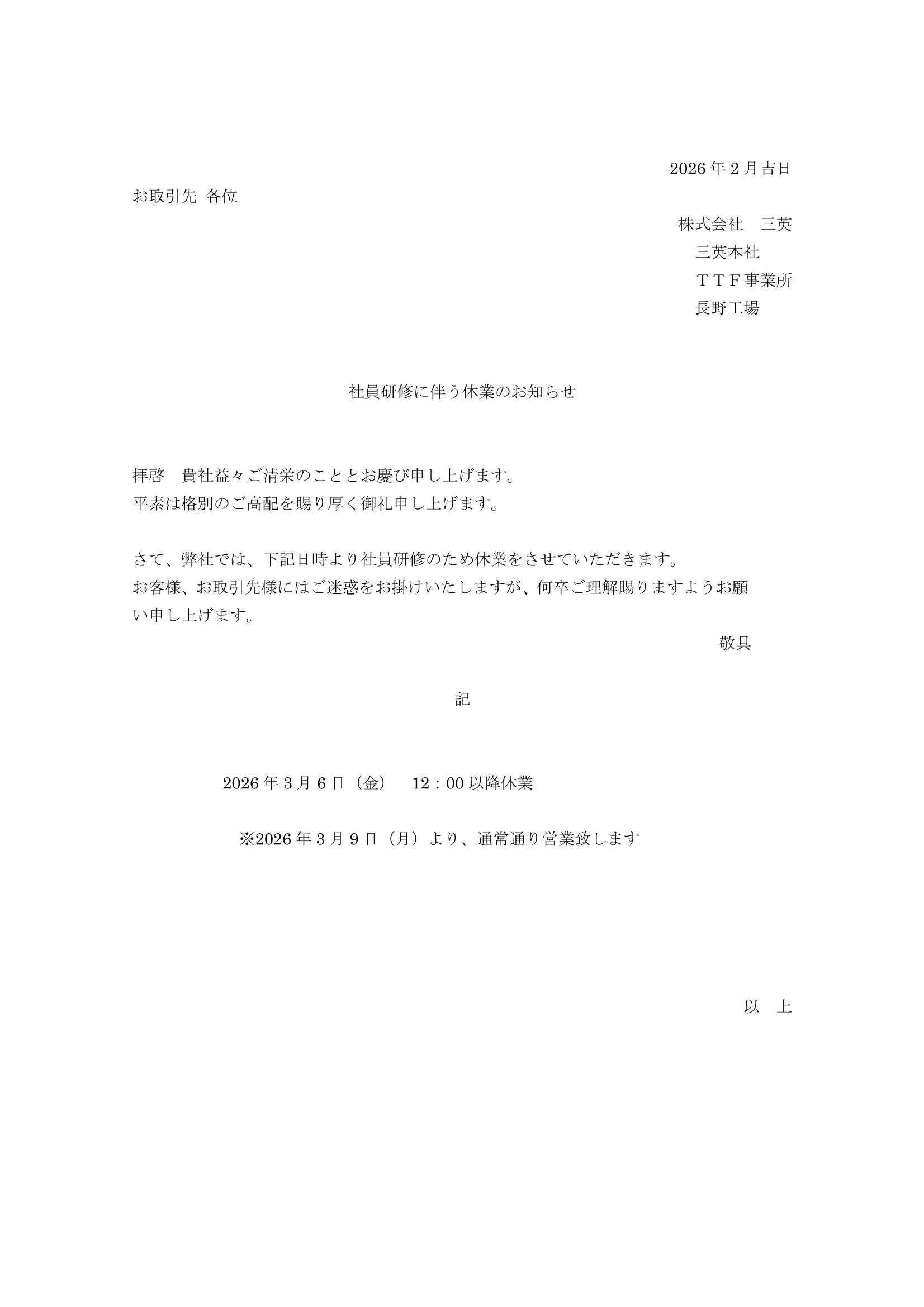 社員研修に伴う休業のお知らせ