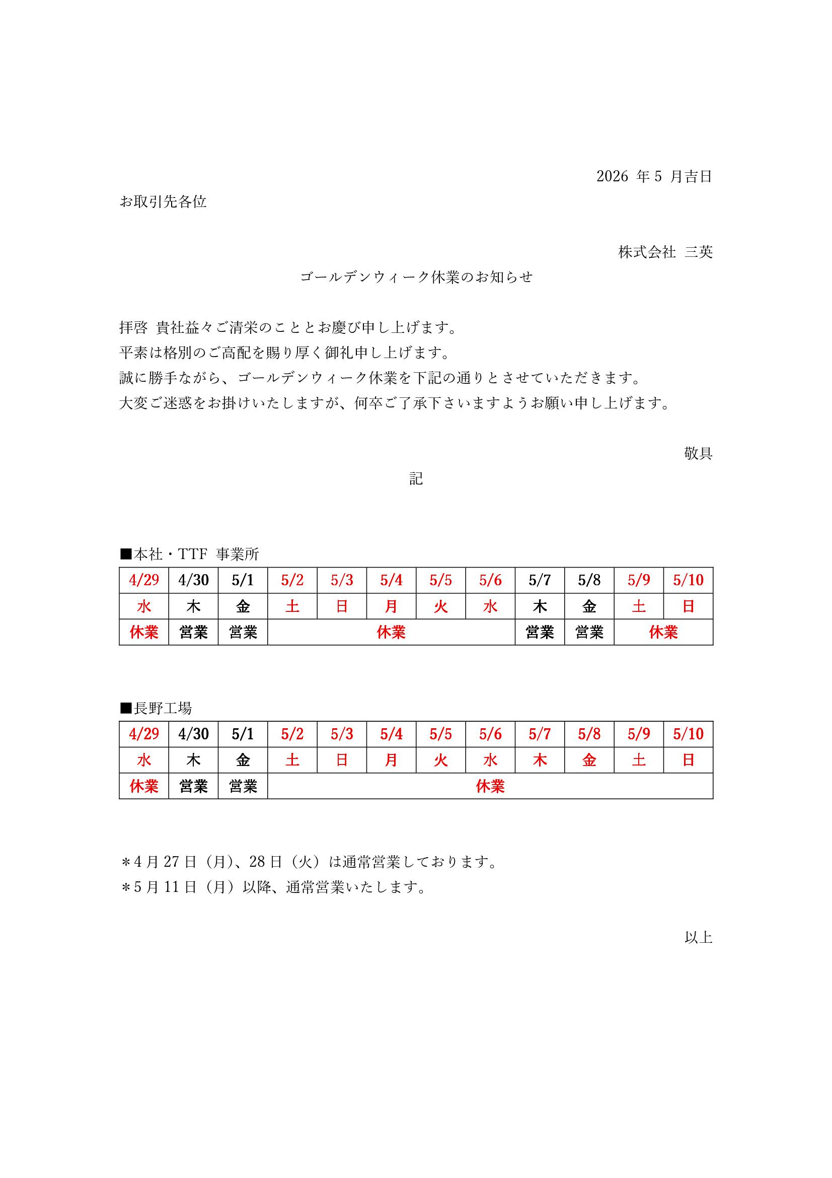 ゴールデンウイーク休業のご案内